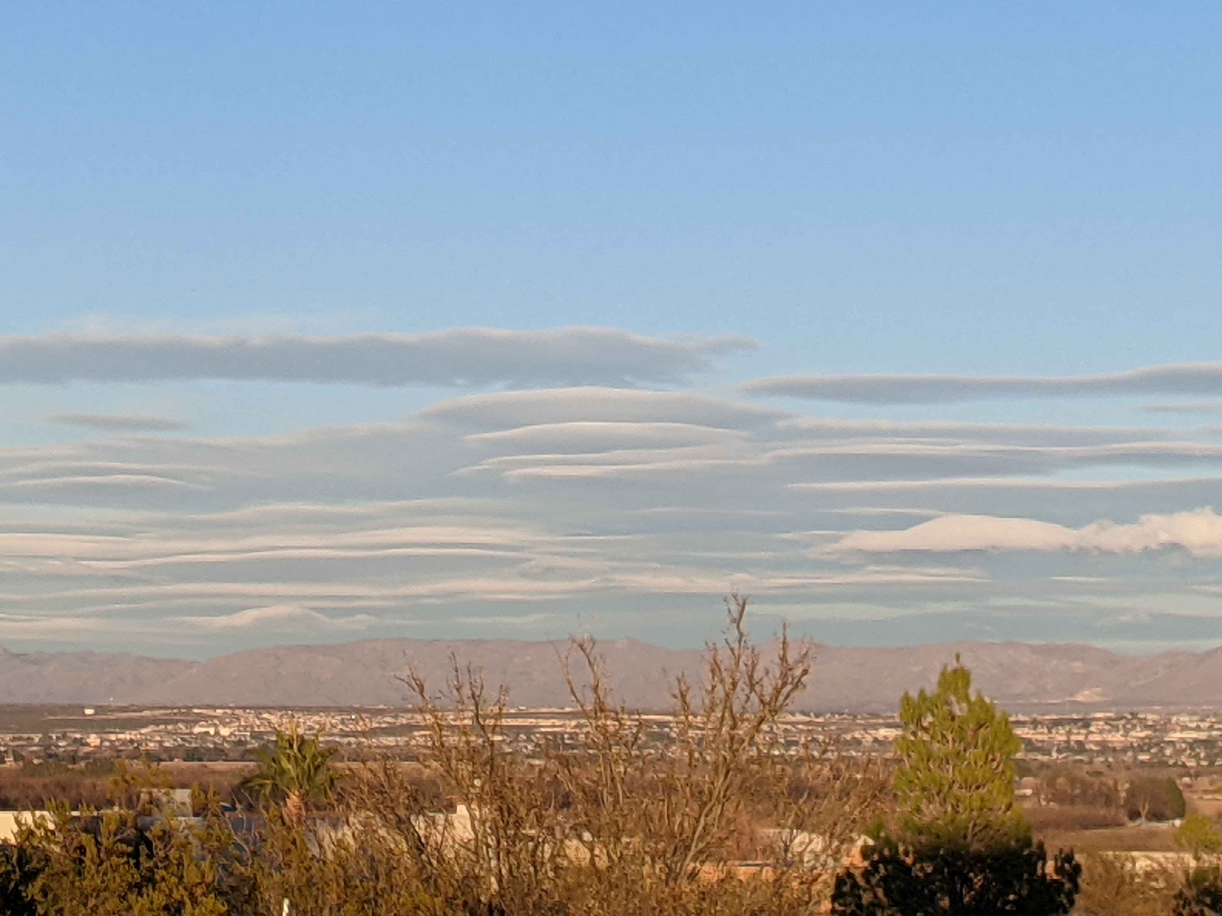 On Wednesday (Feb 3rd) I tweeted (#NMwx), a picture (top) of these spaceship looking clouds over the Organ Mountains in Southern New Mexico . The view is from the western mesa in Las Cruces. (The other two were taken on 12 Dec 2020, before sunset and as the sun was setting.) I wasn’t the only one, many images covered Twitter with #NMwx.