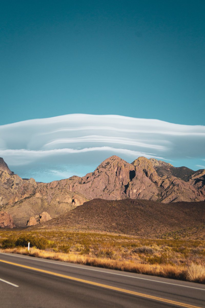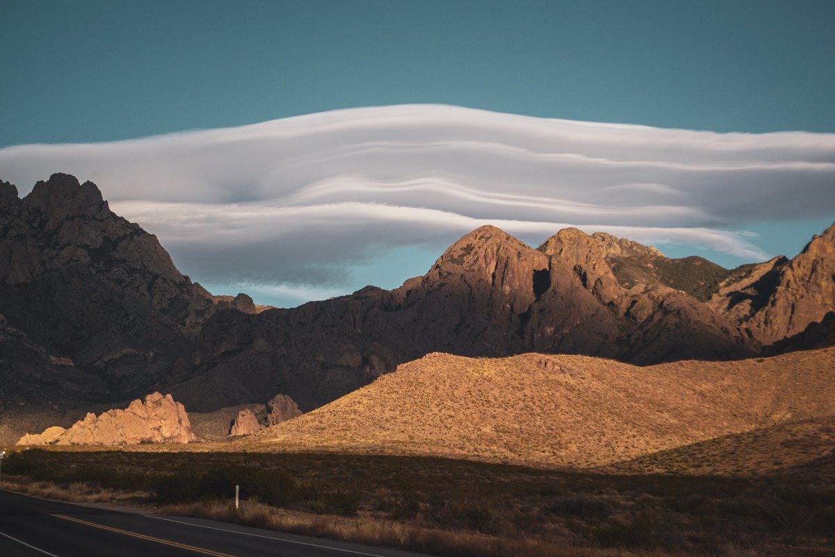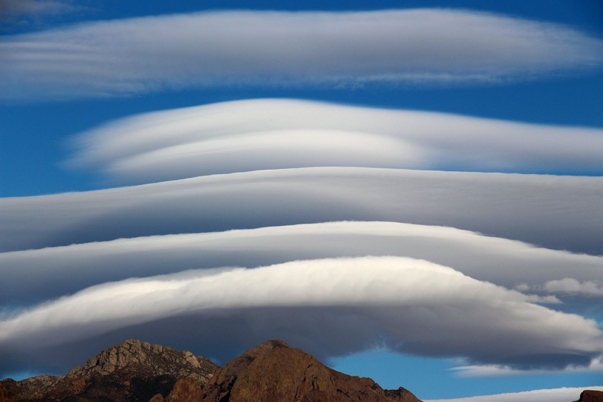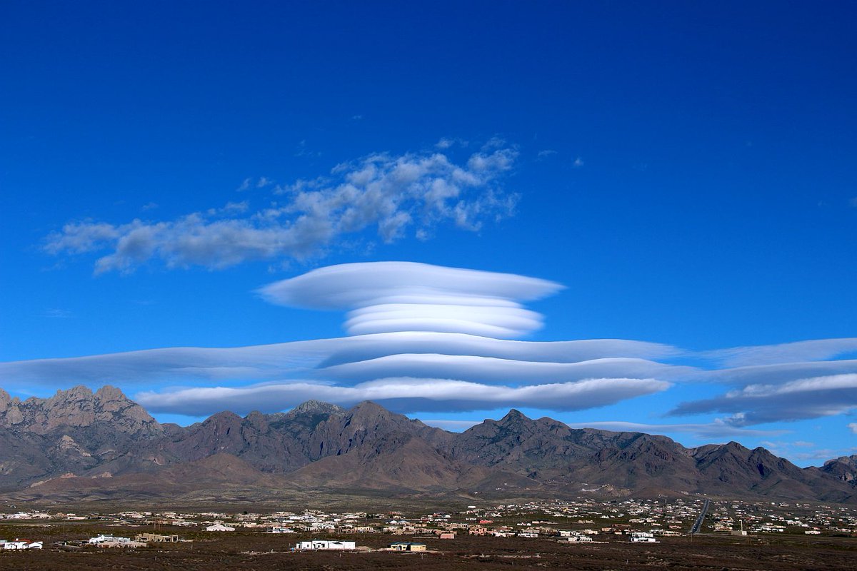 Lenticular Clouds are a phenomena caused by strong winds encountering a feature, in this case the Organ Mountains. In doing so the flow is diverted up and over the mountains. When there is enough moisture in the air, those air parcels cool as they increase in height until they reach saturation and become, for lack of a better term, a cloud drop. Then, as the wind takes those parcels down the other side of the mountain the air parcels warm as they descend and the drops evaporate. All with the appearance of a stationary (or standing) cloud.